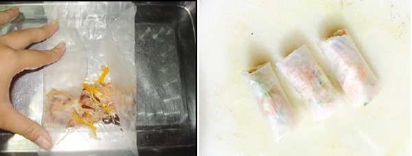 Trải bánh đa nem ra mặt phẳng, cho nhân nem vào giữa bánh đa nem, chiều dài khoảng bằng 1/3 chiều dài bánh đa nem, gập mép 2 đầu rồi cuộn kín bánh đa nem lại là hoàn thành một chiếc nem.